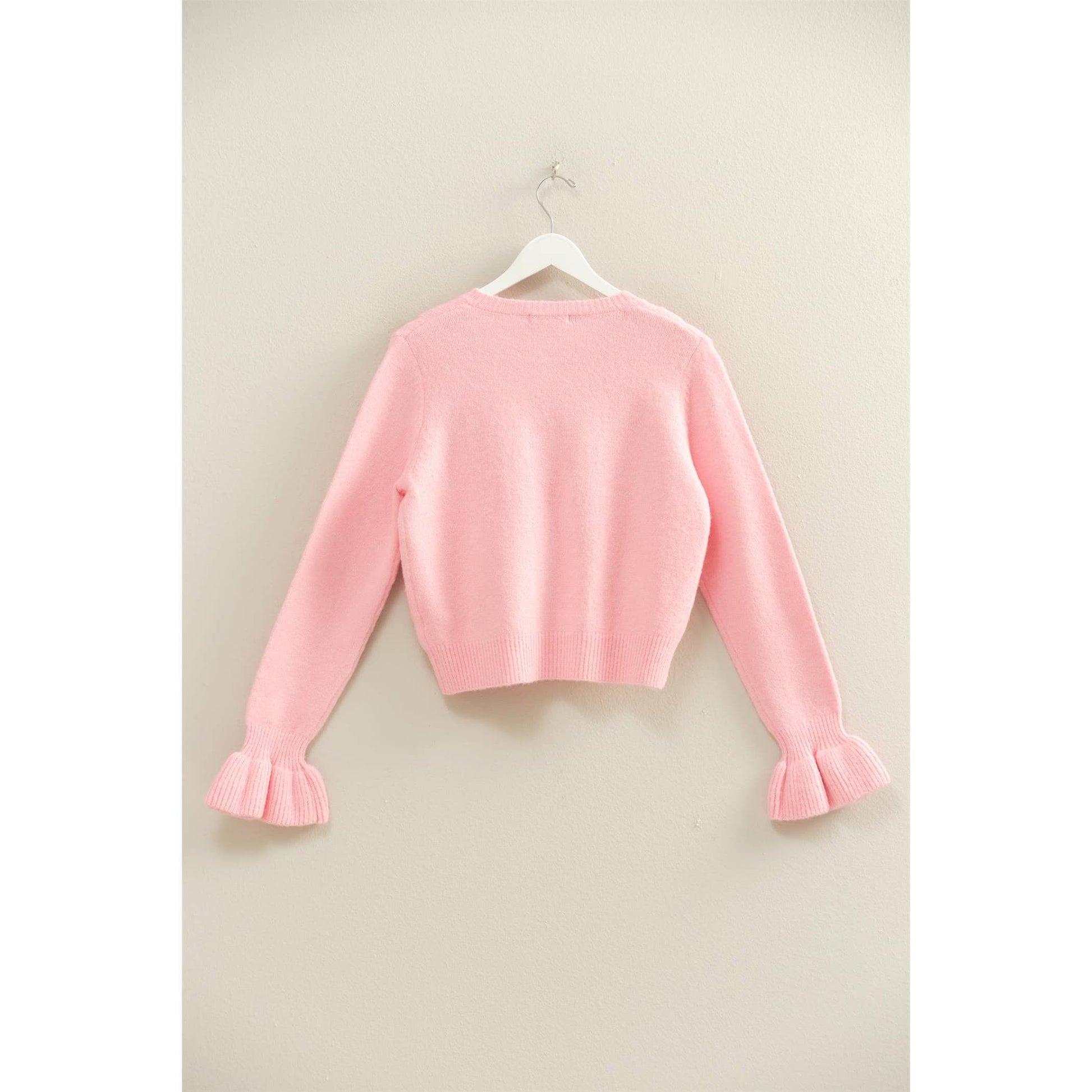 This enchanting sweater captivates with its crewneck design and a series of decorative bows on the front, embracing simplicity and style. Perfect for layering over a crisp collared shirt for a preppy look, this sweater marries comfort with elegance.
