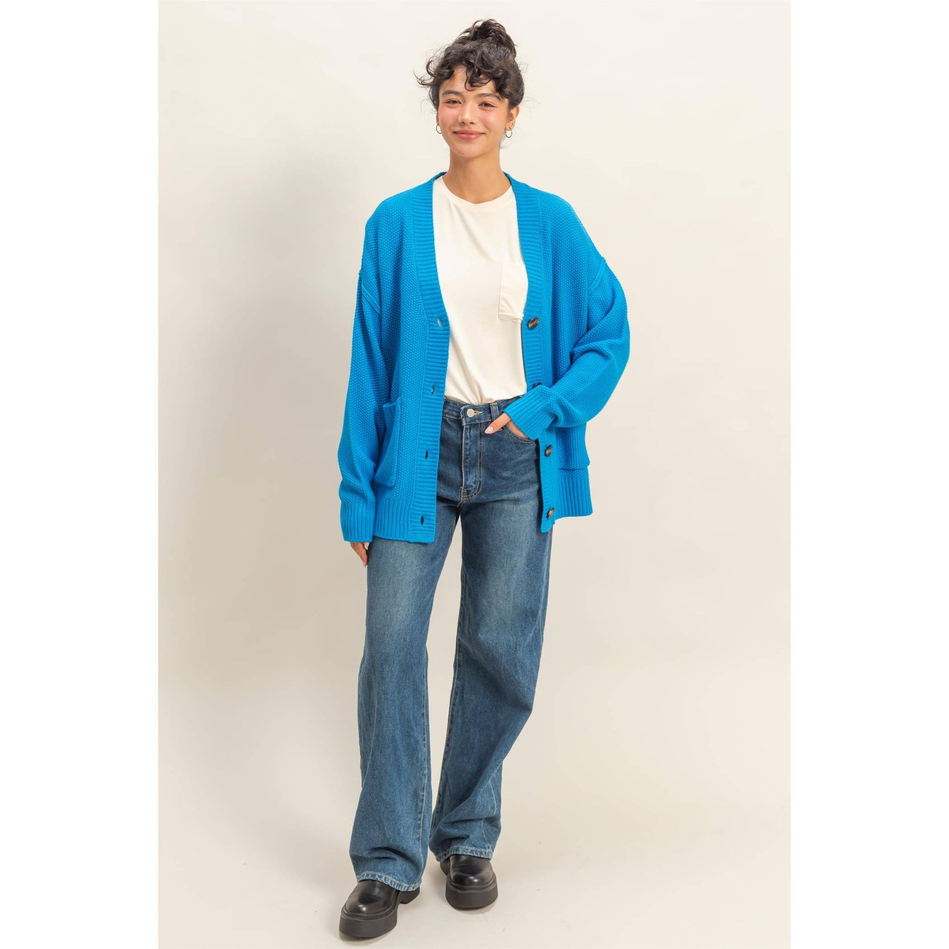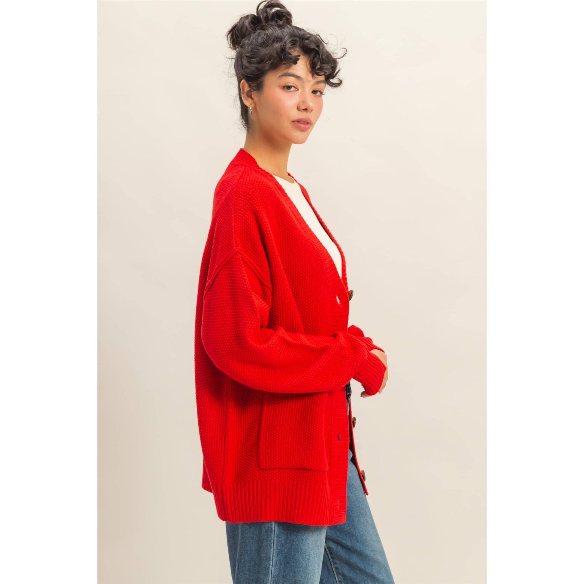Charm Them All In This Versatile And Chic Cardigan That Is Designed Into A Relaxed Silhouette With A V-Neck, Drop Shoulders And Long Sleeves. It Is Fastened By A Button Closure Down The Center And Accented With Front Patch Pockets.