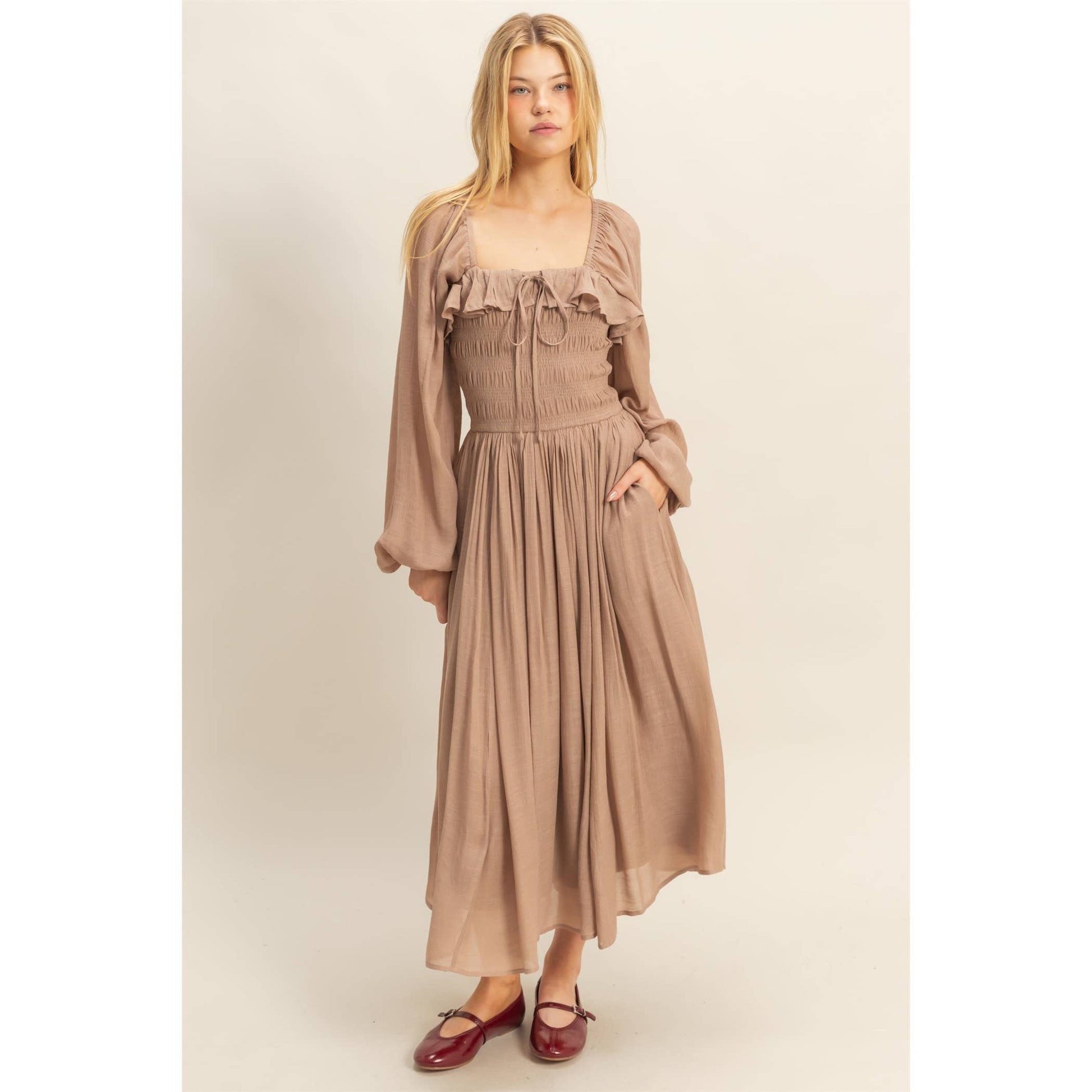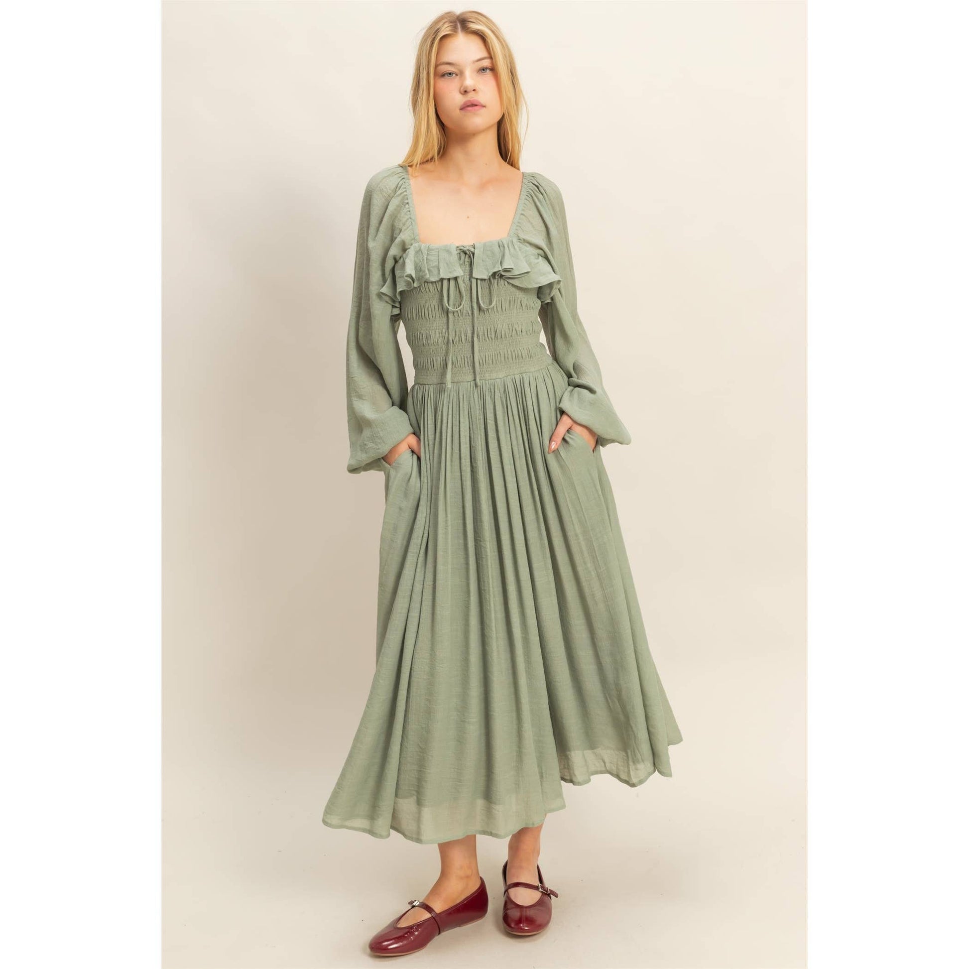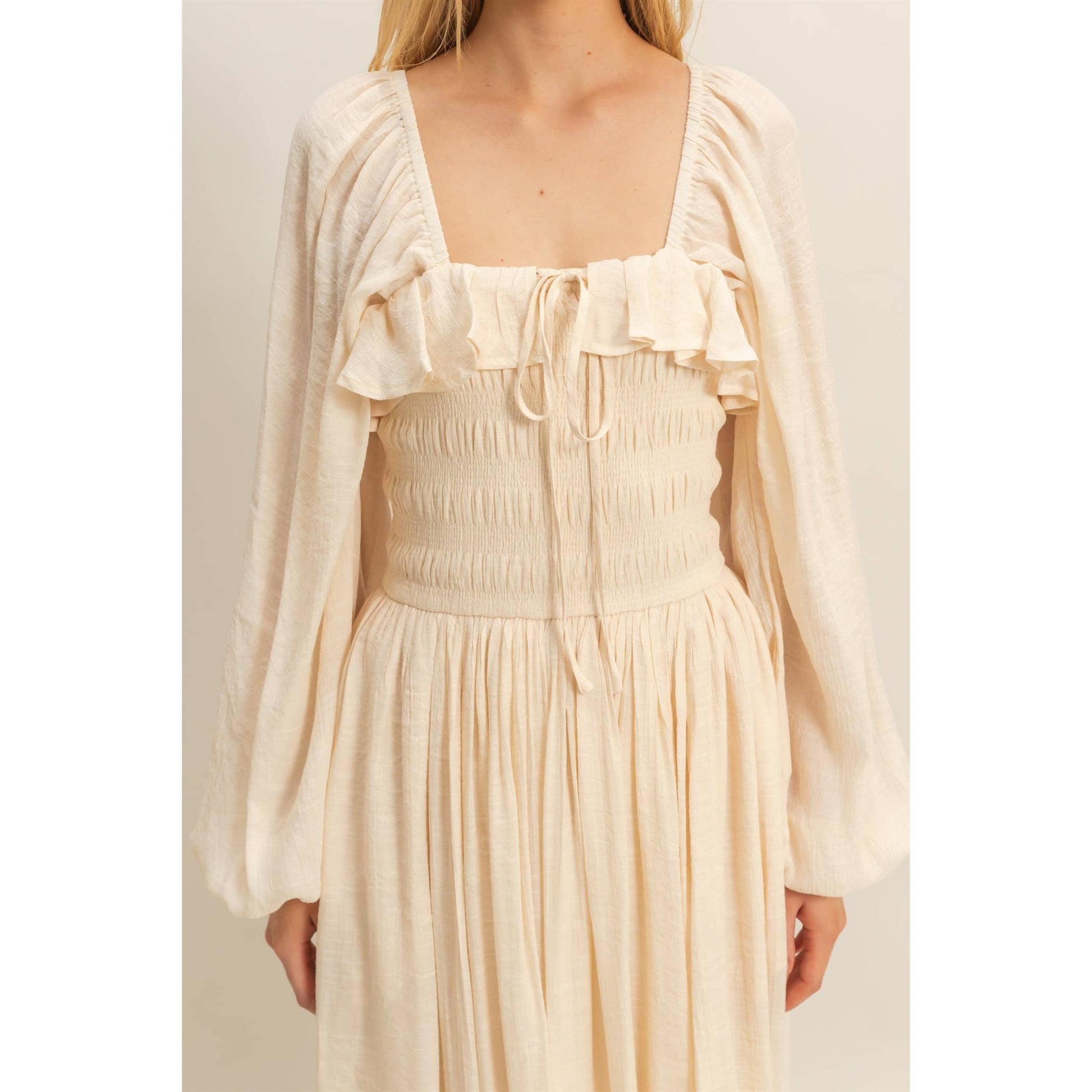 Effortlessly blending romantic flair with a touch of countryside charm, this dress features a smocked bodice that creates a flattering silhouette, ensuring a comfortable and versatile fit. The delicate frill detailing along the square neckline adds a playful element, while the gently puffed long sleeves provide a soft, ethereal quality.