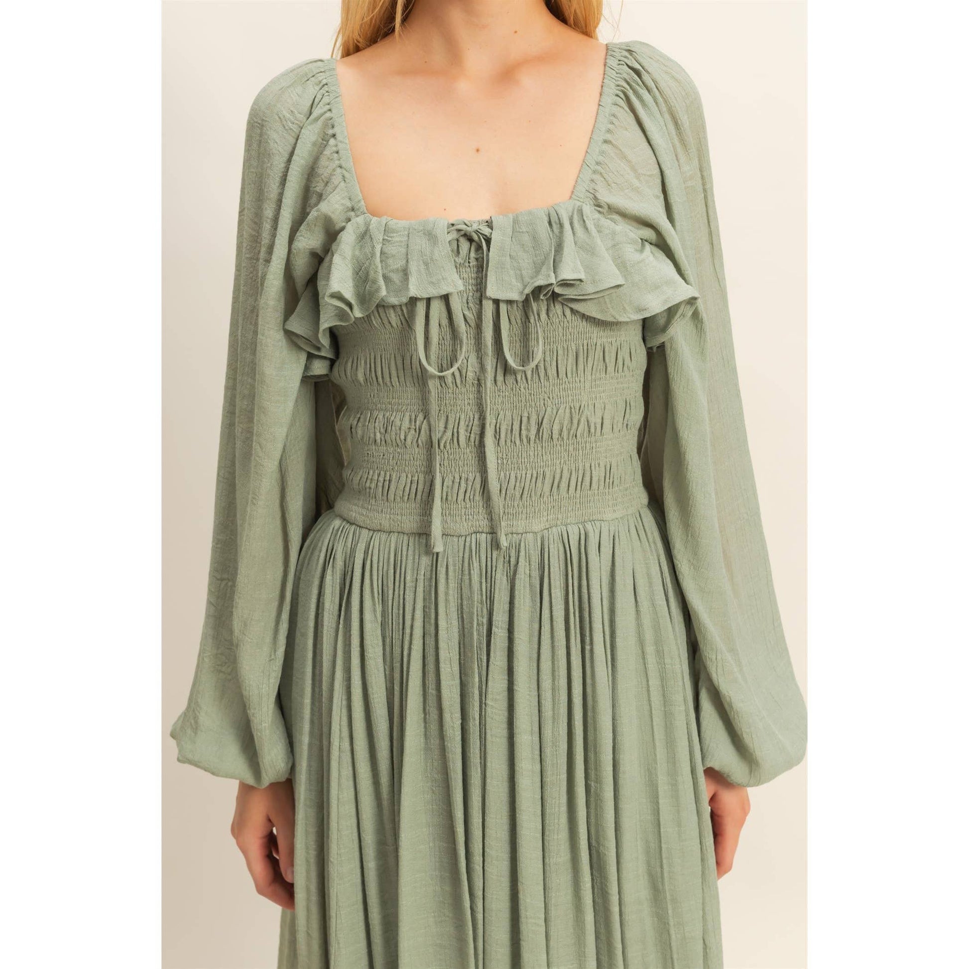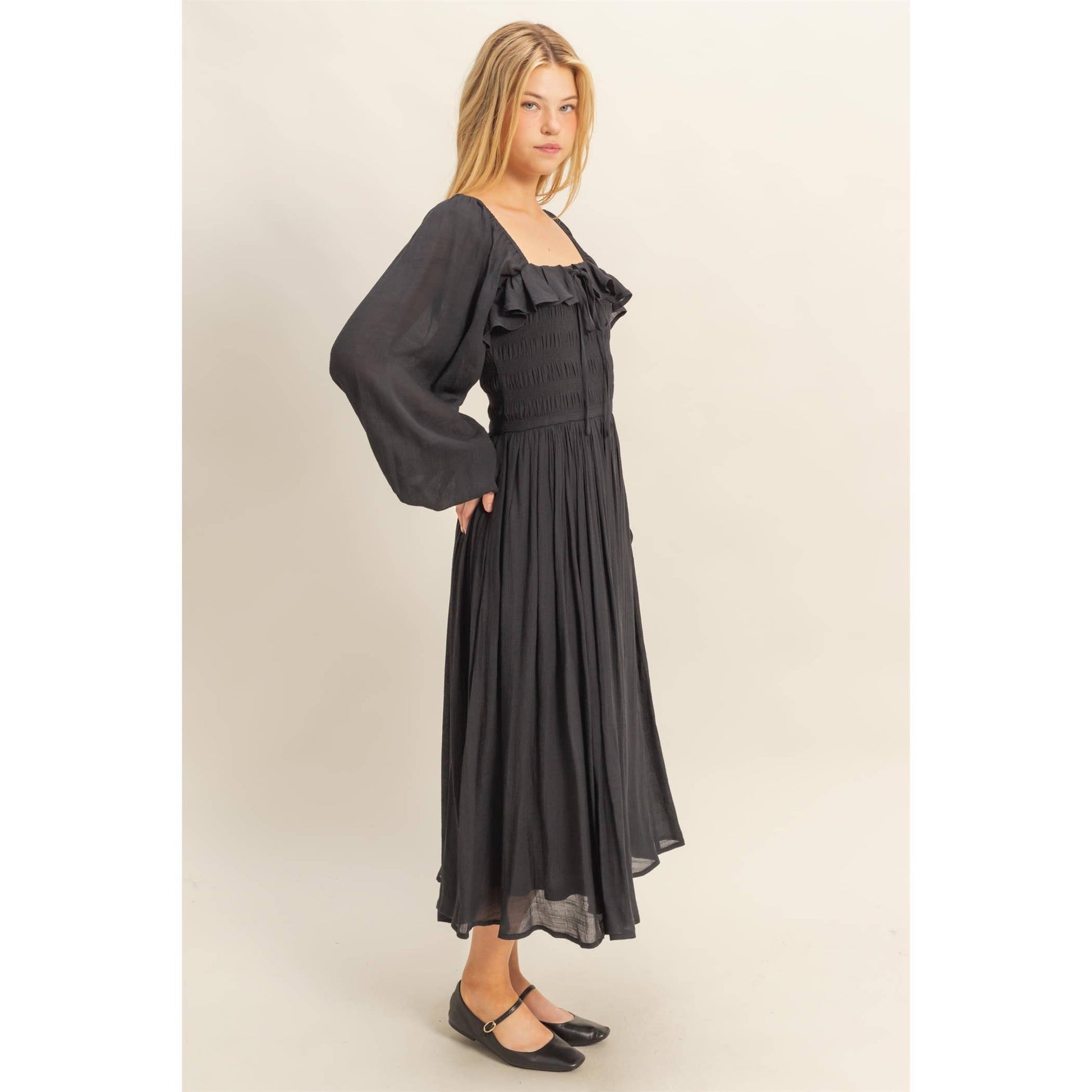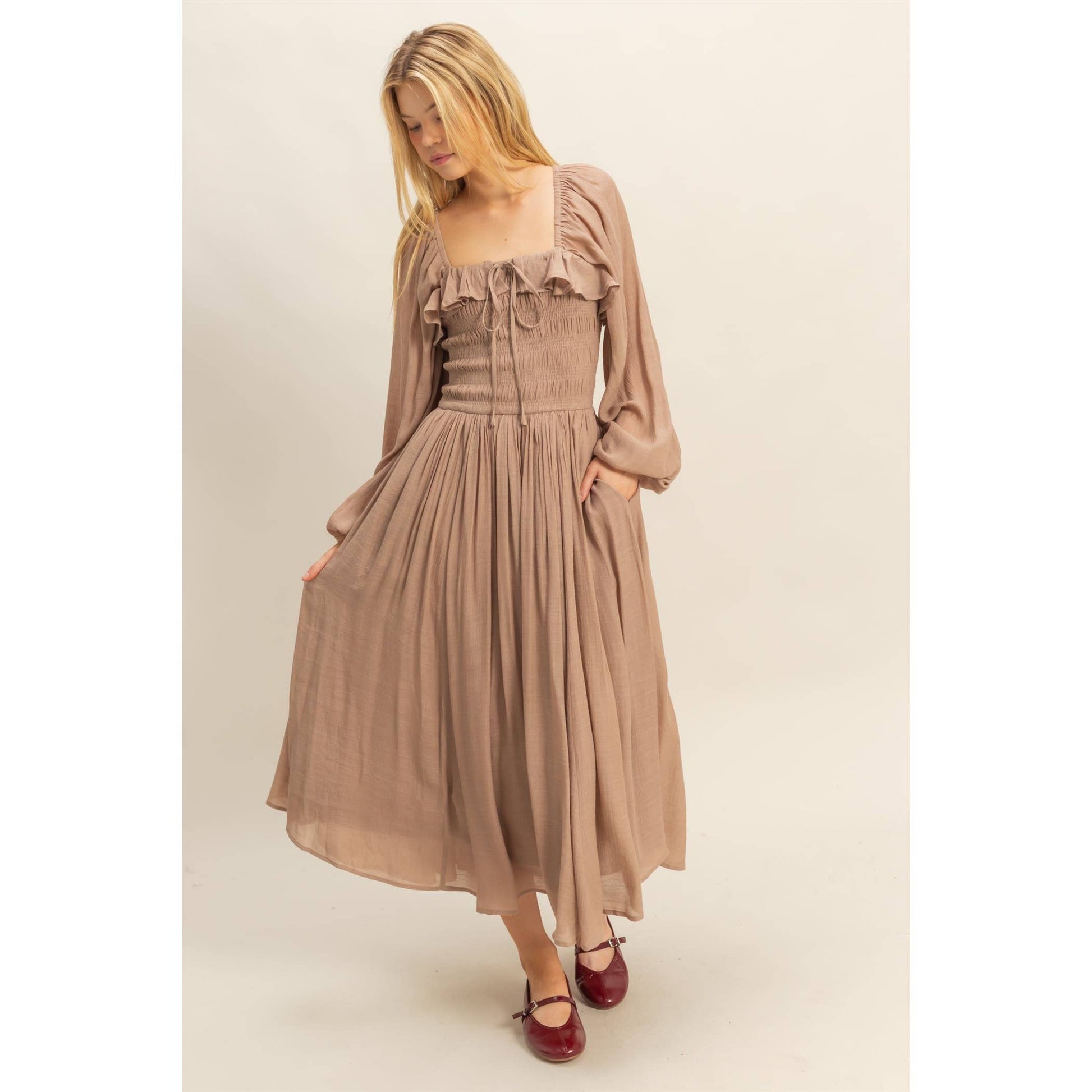 Effortlessly blending romantic flair with a touch of countryside charm, this dress features a smocked bodice that creates a flattering silhouette, ensuring a comfortable and versatile fit. The delicate frill detailing along the square neckline adds a playful element, while the gently puffed long sleeves provide a soft, ethereal quality.