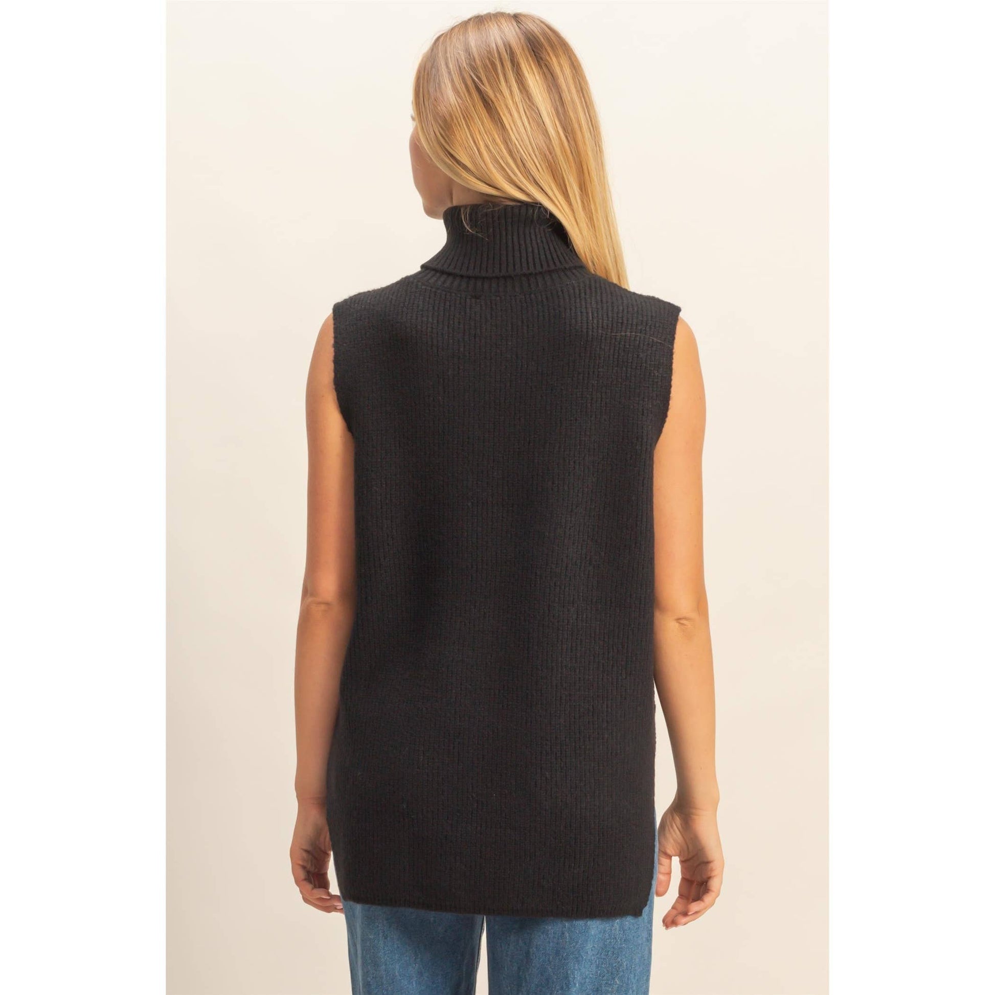 This sleeveless turtleneck sweater offers a blend of structure and versatility, perfect for layering or wearing standalone. Pair it with fitted jeans or a flowing skirt for a balanced, effortlessly stylish look. Its understated design ensures adaptability for either a casual setting or a more dress-up occasion. Complete the ensemble with a statement necklace or bold earrings to elevate the outfit.